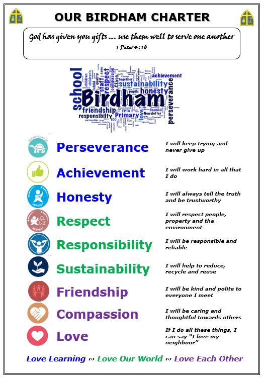 The children, staff, parents and governors were all involved in shaping our nine Christian core values that we believe are central to everything that we do in school. The children helped to design our Birdham Charter as below: