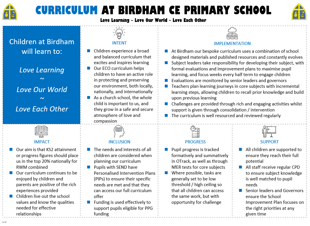 Birdham CE Primary School, along with nearly all schools nationally, teaches the statutory National Curriculum. We are constantly reviewing our curriculum provision to ensure it meets the needs of all our pupils who are currently in school. This type of adapted curriculum therefore changes slightly every year, but we actively seek external moderation and collaborate with other local schools to ensure our offer is always excellent and the best it can possibly be.